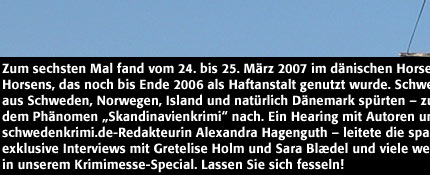 Zum sechsten Mal fand vom 24. bis 25. März im dänischen Horsens die Krimimesse statt – in diesem Jahr im alten Staatsgefängnis von Horsens, das noch bis Ende 2006 als Haftanstalt genutzt wurde und nun zum Verkauf steht. Schwerpunkt der Messe 2007 war der skandinavische Krimi selbst. Autoren aus Schweden, Norwegen, Island und natürlich Dänemark gingen – zusammen mit Kritikern und rund 1.850 Besuchern an zwei Tagen – dem Phänomen „Skandinavienkrimi“ nach. Ein Hearing mit Autoren und Kritikern – darunter Arne Dahl, Gretelise Holm, Nils Nordberg und schwedenkrimi.de-Redakteurin Alexandra Hagenguth – leitete am Samstagmorgen die spannende Diskussion ein.